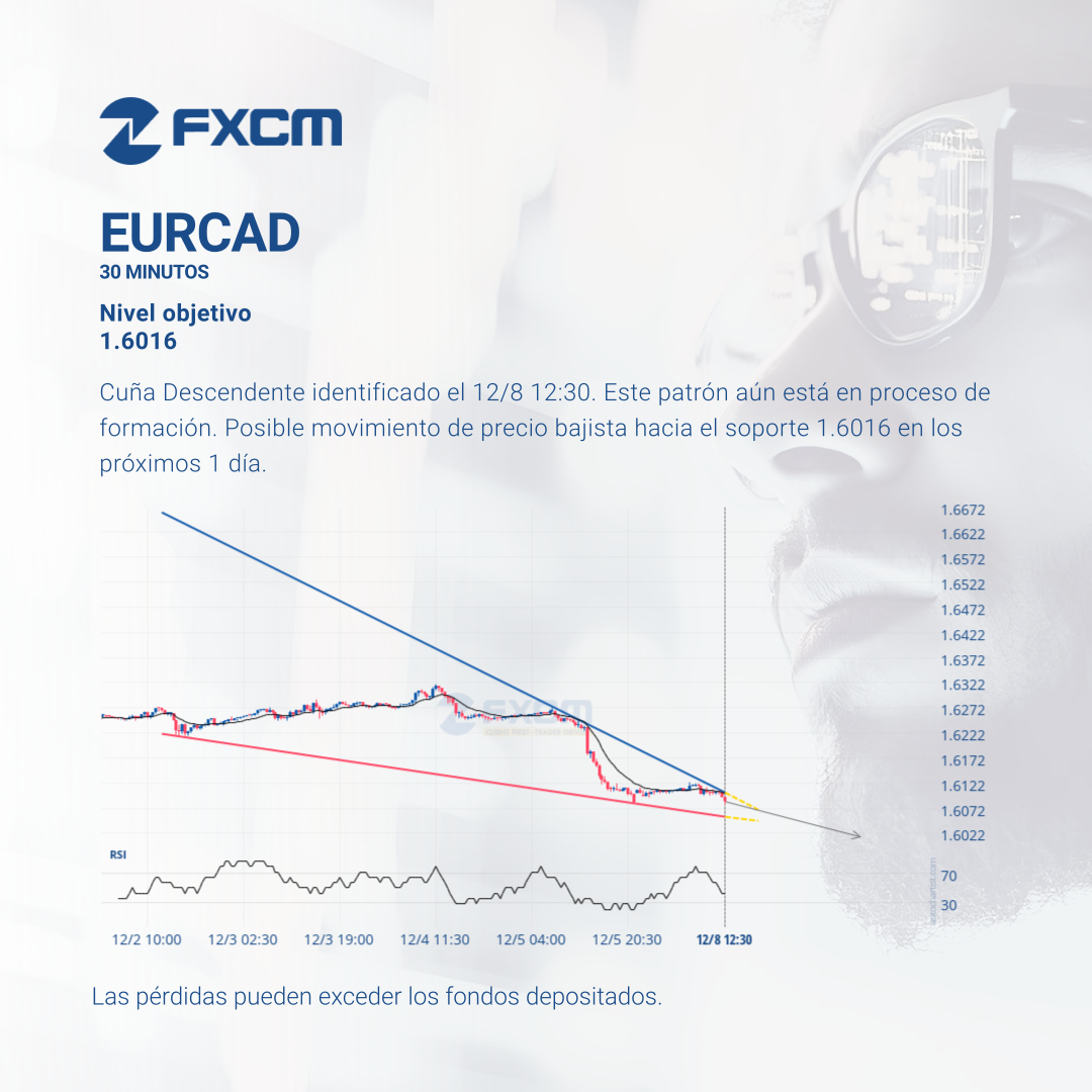 Cuña Descendente identificado el 12/8 12:30. Este patrón aún está en proceso de formación. Posible movimiento de precio bajista hacia el soporte 1.6016 en los próximos 1 día.
