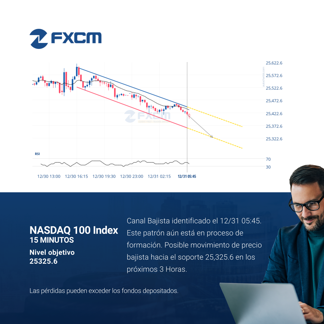 Canal Bajista identificado el 12/31 05:45. Este patrón aún está en proceso de formación. Posible movimiento de precio bajista hacia el soporte 25,325.6 en los próximos 3 Horas.