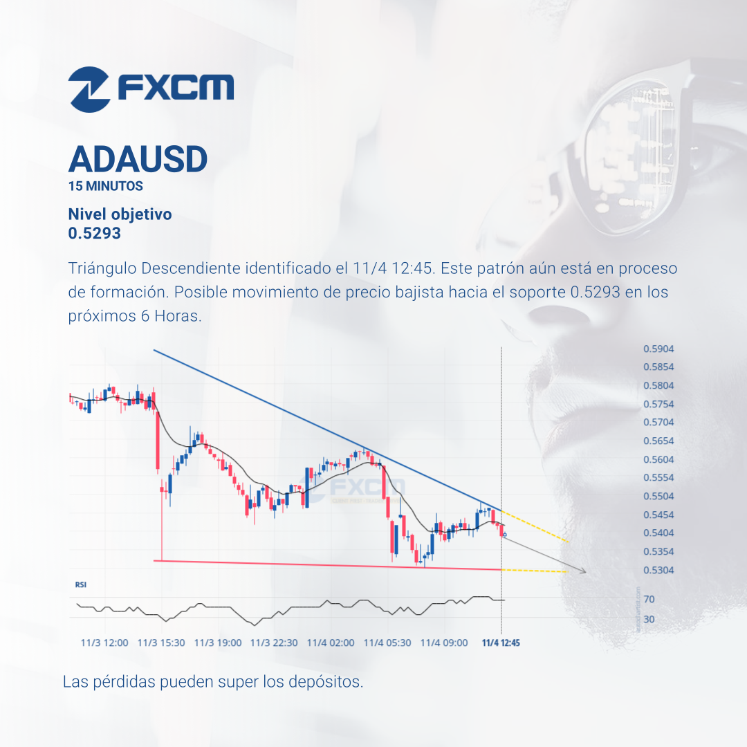 Triángulo Descendiente identificado el 11/4 12:45. Este patrón aún está en proceso de formación. Posible movimiento de precio bajista hacia el soporte 0.5293 en los próximos 6 Horas.