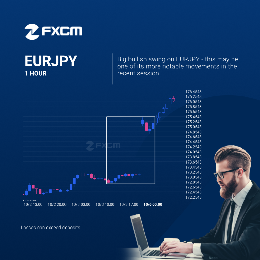 An unexpected large move occurred on EURJPY 1 hour chart, starting at 172.816 and reaching 175.1925. It stands out in recent trading activity. Past performance is not an indicator of future results. Losses can exceed deposits.