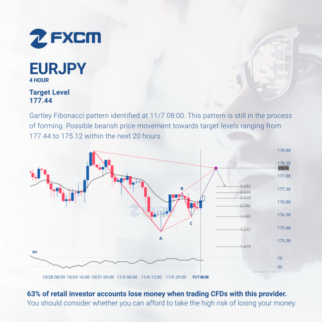 Gartley Fibonacci pattern identified at 11/7 08:00. This pattern is still in the process of forming. Possible bearish price movement towards target levels ranging from 177.44 to 175.12 within the next 20 hours. Past performance is not an indicator of future results. Losses can exceed deposits.