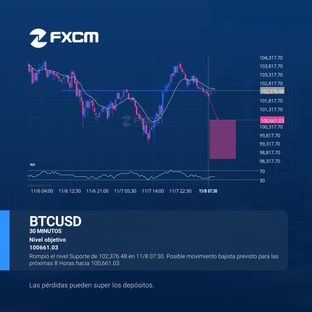 Rompió el nivel Suporte de 102,376.48 en 11/8 07:30. Posible movimiento bajista previsto para las próximas 8 Horas hacia 100,661.03. El rendimiento pasado no es indicativo de resultados futuros. Las pérdidas pueden exceder los fondos depositados.