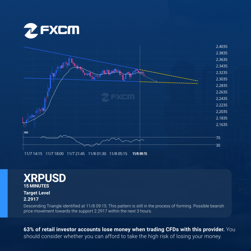 Descending Triangle identified at 11/8 09:15. This pattern is still in the process of forming. Possible bearish price movement towards the support 2.2917 within the next 3 hours. Past performance is not an indicator of future results. Losses can exceed deposits.