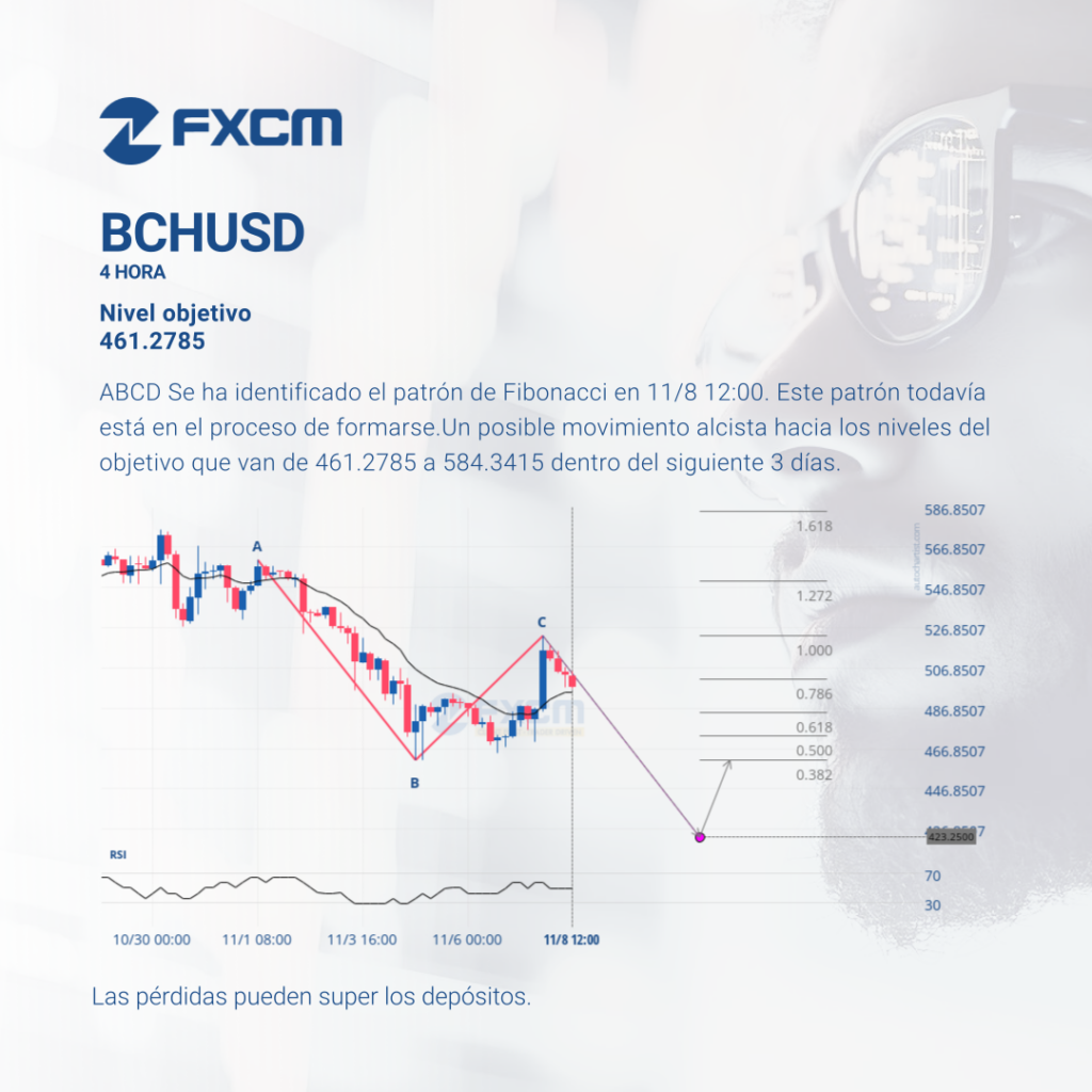 ABCD Se ha identificado el patrón de Fibonacci en 11/8 12:00. Este patrón todavía está en el proceso de formarse.Un posible movimiento alcista hacia los niveles del objetivo que van de 461.2785 a 584.3415 dentro del siguiente 3 días. El rendimiento pasado no es indicativo de resultados futuros. Las pérdidas pueden exceder los fondos depositados.