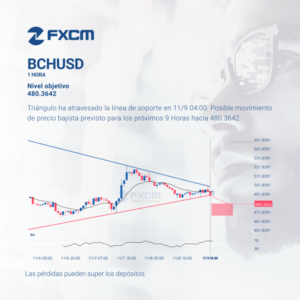 Triángulo ha atravesado la línea de soporte en 11/9 04:00. Posible movimiento de precio bajista previsto para los próximos 9 Horas hacia 480.3642. El rendimiento pasado no es indicativo de resultados futuros. Las pérdidas pueden exceder los fondos depositados.