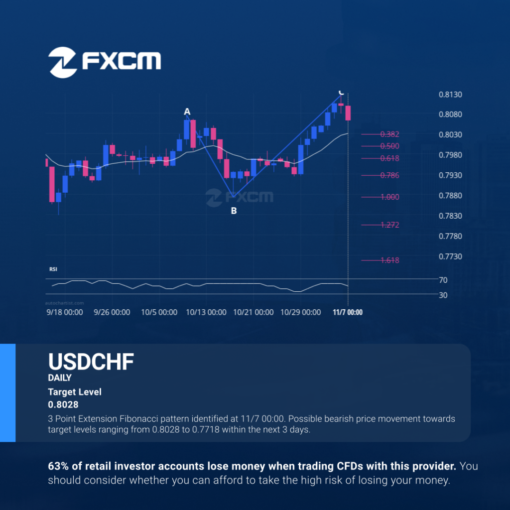 3 Point Extension Fibonacci pattern identified at 11/7 00:00. Possible bearish price movement towards target levels ranging from 0.8028 to 0.7718 within the next 3 days. Past performance is not an indicator of future results. Losses can exceed deposits.