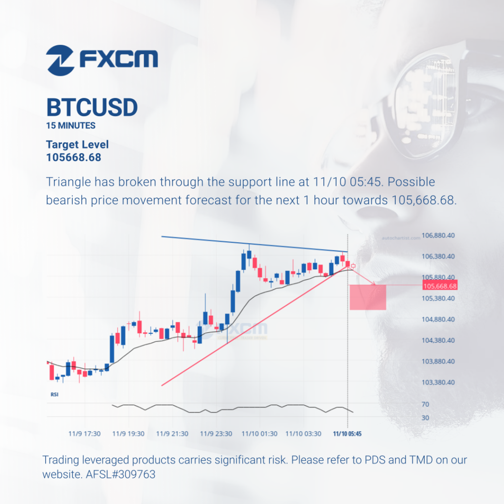 Triangle has broken through the support line at 11/10 05:45. Possible bearish price movement forecast for the next 1 hour towards 105,668.68. Past performance is not an indicator of future results. Trading leveraged products carries significant risk. Please refer to PDS and TMD on our website. AFSL#309763