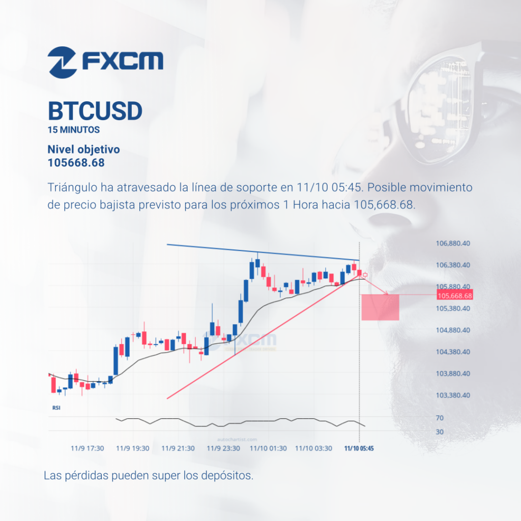 Triángulo ha atravesado la línea de soporte en 11/10 05:45. Posible movimiento de precio bajista previsto para los próximos 1 Hora hacia 105,668.68. El rendimiento pasado no es indicativo de resultados futuros. Las pérdidas pueden exceder los fondos depositados.