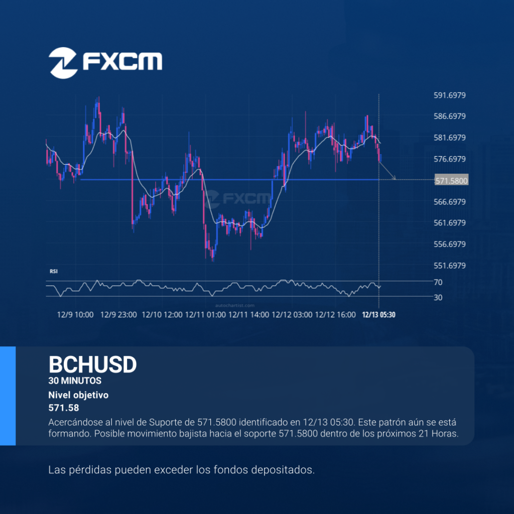 Acercándose al nivel de Suporte de 571.5800 identificado en 12/13 05:30. Este patrón aún se está formando. Posible movimiento bajista hacia el soporte 571.5800 dentro de los próximos 21 Horas. El rendimiento pasado no es indicativo de resultados futuros. Las pérdidas pueden exceder los depósitos.
