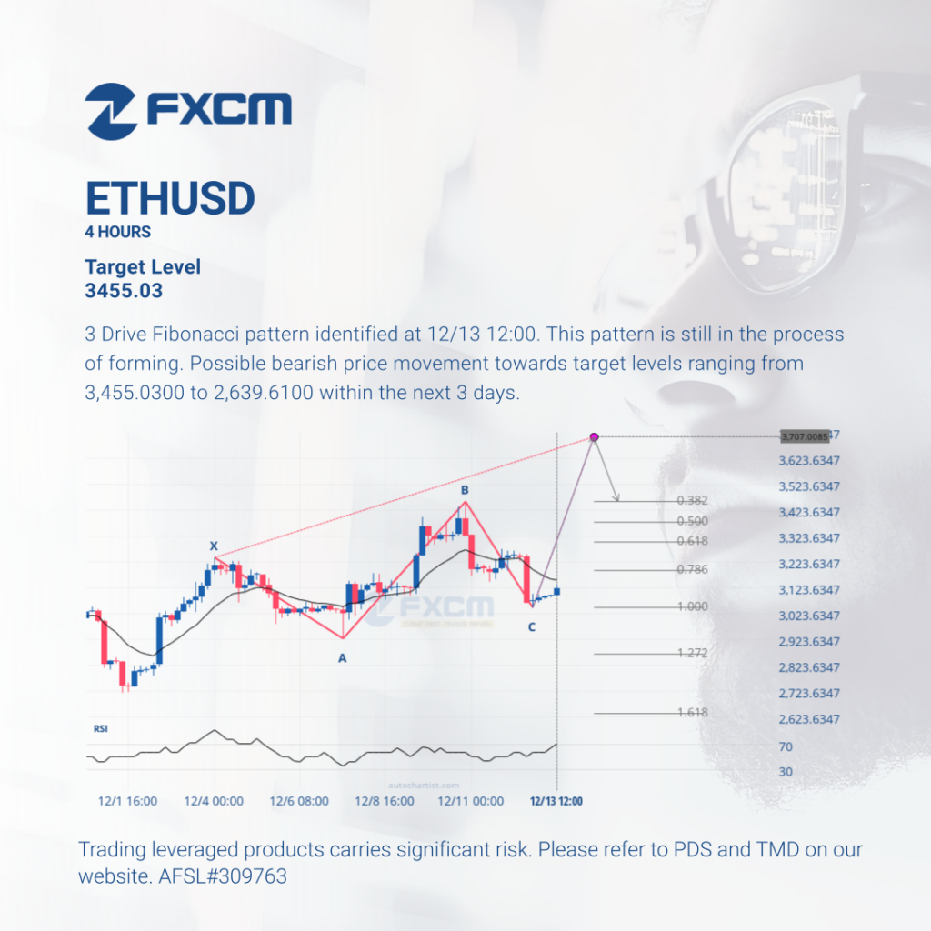 3 Drive Fibonacci pattern identified at 12/13 12:00. This pattern is still in the process of forming. Possible bearish price movement towards target levels ranging from 3,455.0300 to 2,639.6100 within the next 3 days. Past performance is not an indicator of future results. Trading leveraged products carries significant risk. Please refer to PDS and TMD […]