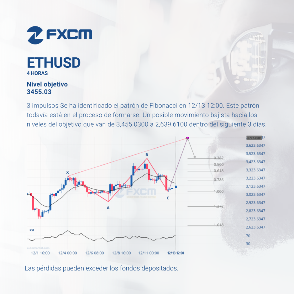 3 impulsos Se ha identificado el patrón de Fibonacci en 12/13 12:00. Este patrón todavía está en el proceso de formarse. Un posible movimiento bajista hacia los niveles del objetivo que van de 3,455.0300 a 2,639.6100 dentro del siguiente 3 días. El rendimiento pasado no es indicativo de resultados futuros. Las pérdidas pueden exceder los depósitos.