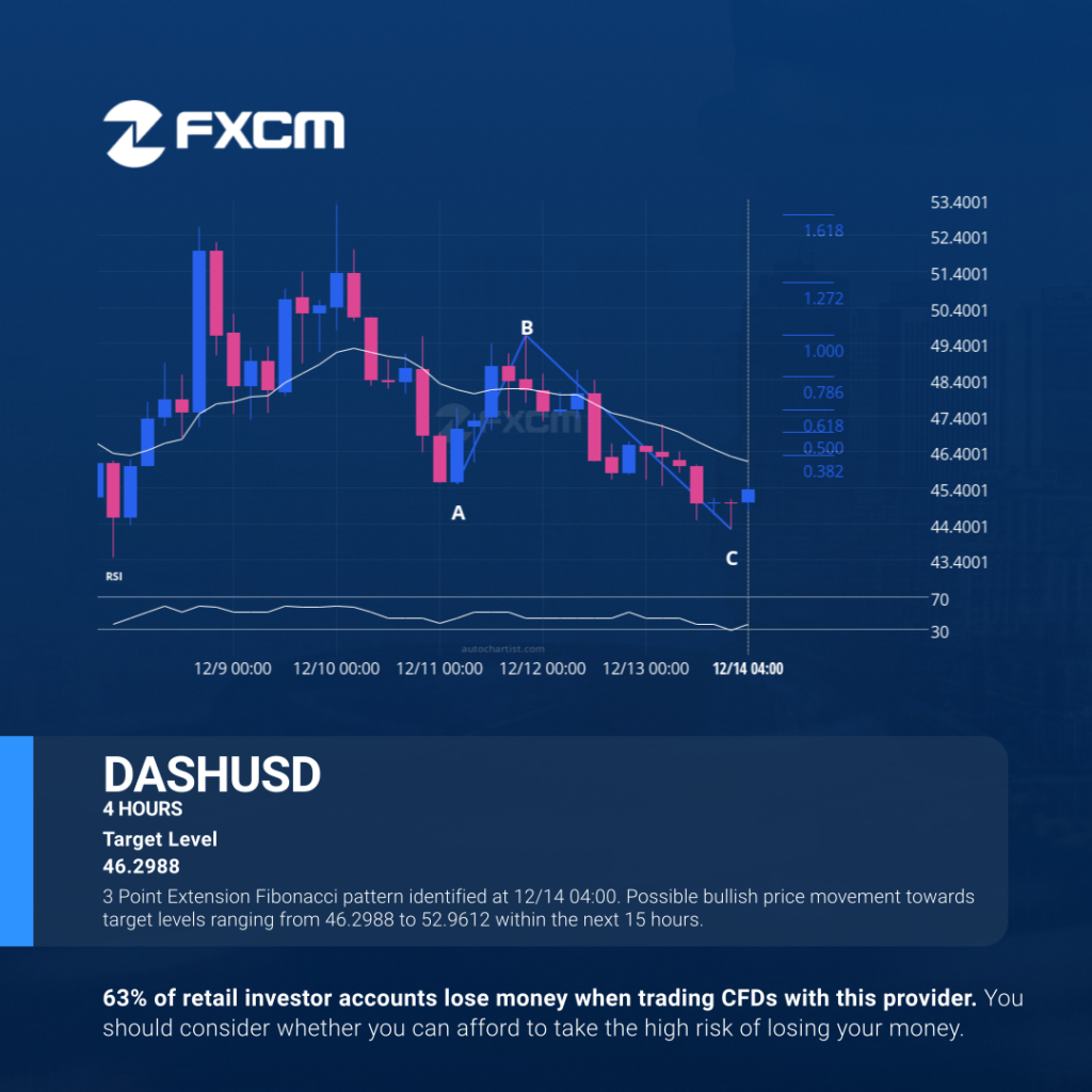 3 Point Extension Fibonacci pattern identified at 12/14 04:00. Possible bullish price movement towards target levels ranging from 46.2988 to 52.9612 within the next 15 hours. Past performance is not an indicator of future results. Losses can exceed deposits.