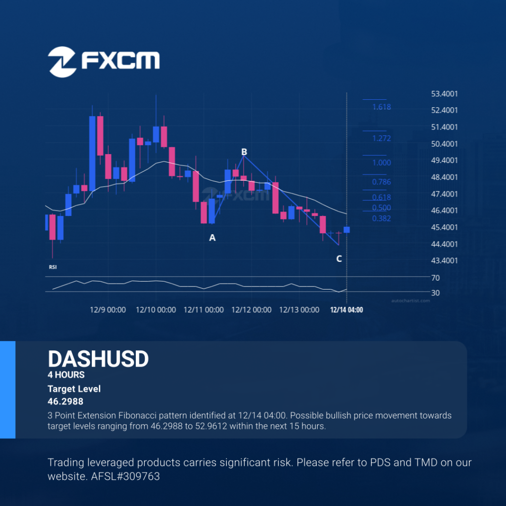 3 Point Extension Fibonacci pattern identified at 12/14 04:00. Possible bullish price movement towards target levels ranging from 46.2988 to 52.9612 within the next 15 hours. Past performance is not an indicator of future results. Trading leveraged products carries significant risk. Please refer to PDS and TMD on our website. AFSL#309763