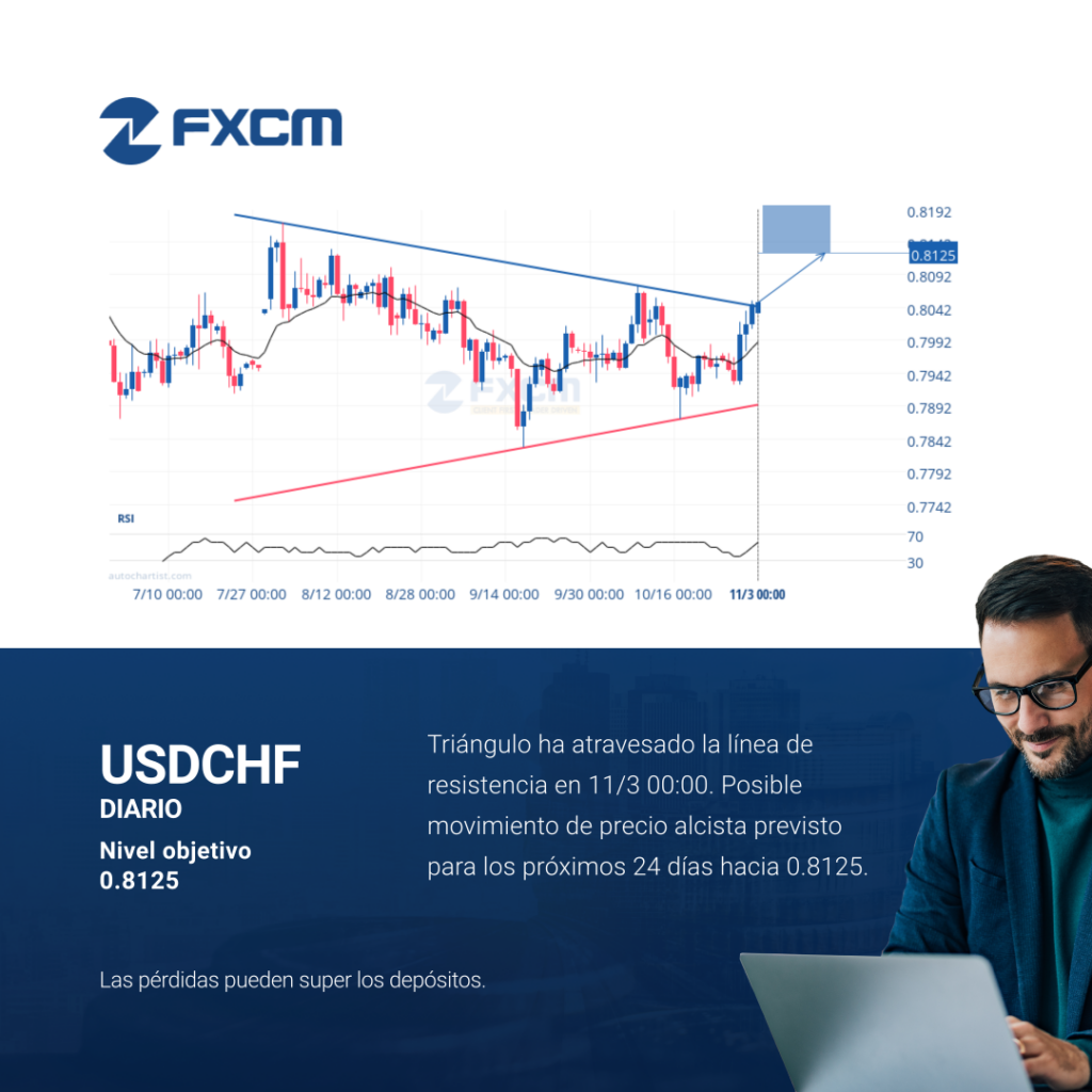 Triángulo ha atravesado la línea de resistencia en 11/3 00:00. Posible movimiento de precio alcista previsto para los próximos 24 días hacia 0.8125. El rendimiento pasado no es indicativo de resultados futuros. Las pérdidas pueden exceder los fondos depositados.