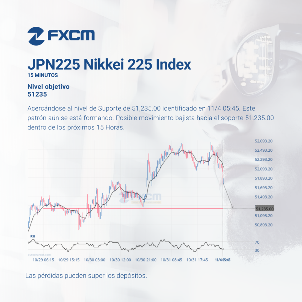 Acercándose al nivel de Suporte de 51,235.00 identificado en 11/4 05:45. Este patrón aún se está formando. Posible movimiento bajista hacia el soporte 51,235.00 dentro de los próximos 15 Horas. El rendimiento pasado no es indicativo de resultados futuros. Las pérdidas pueden exceder los fondos depositados.