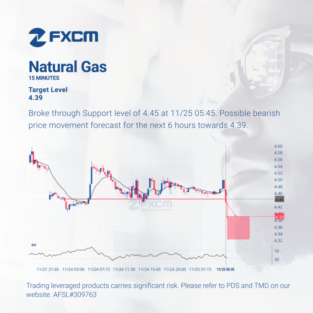 Broke through Support level of 4.45 at 11/25 05:45. Possible bearish price movement forecast for the next 6 hours towards 4.39. Past performance is not an indicator of future results. Trading leveraged products carries significant risk. Please refer to PDS and TMD on our website. AFSL#309763