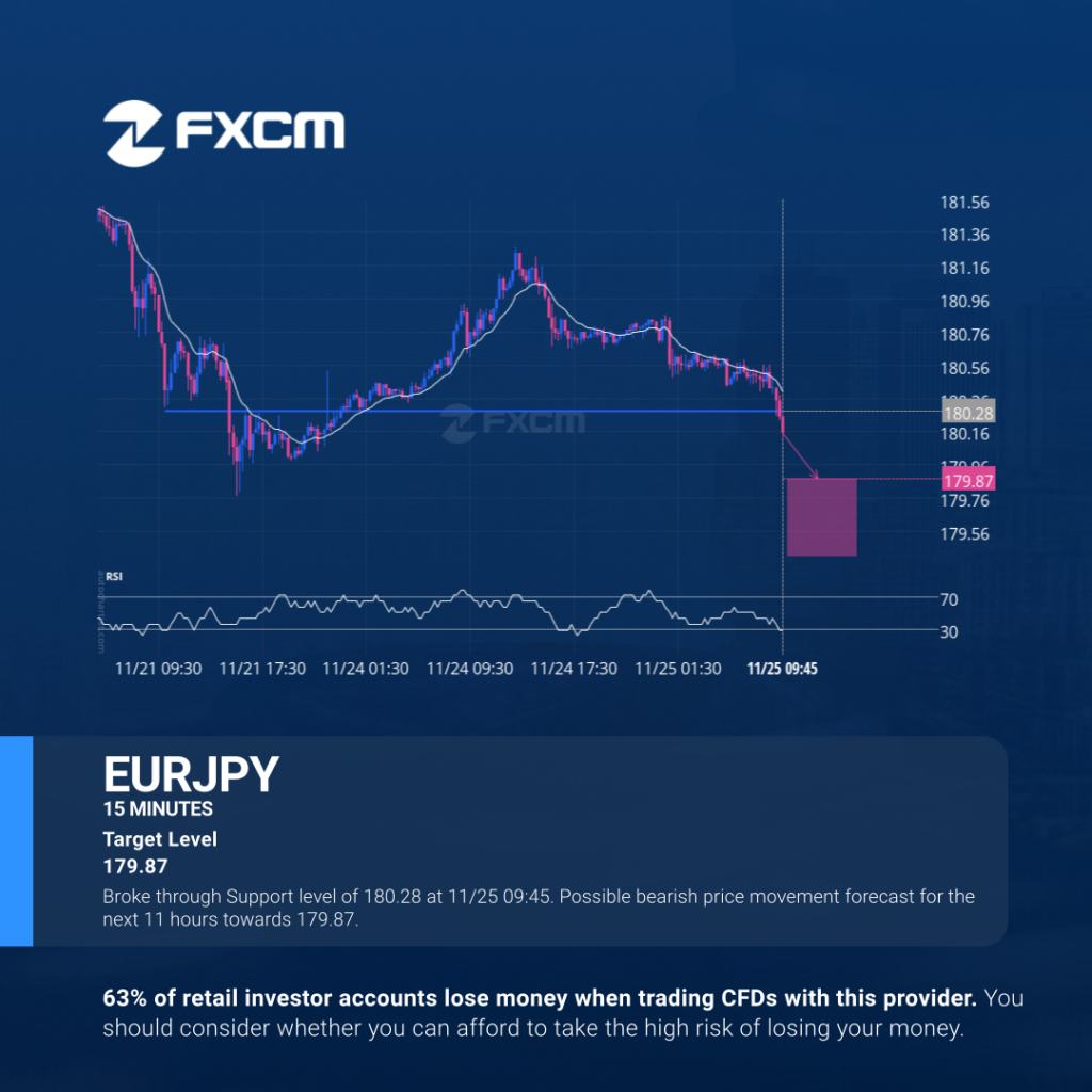 Broke through Support level of 180.28 at 11/25 09:45. Possible bearish price movement forecast for the next 11 hours towards 179.87. Past performance is not an indicator of future results. Losses can exceed deposits.