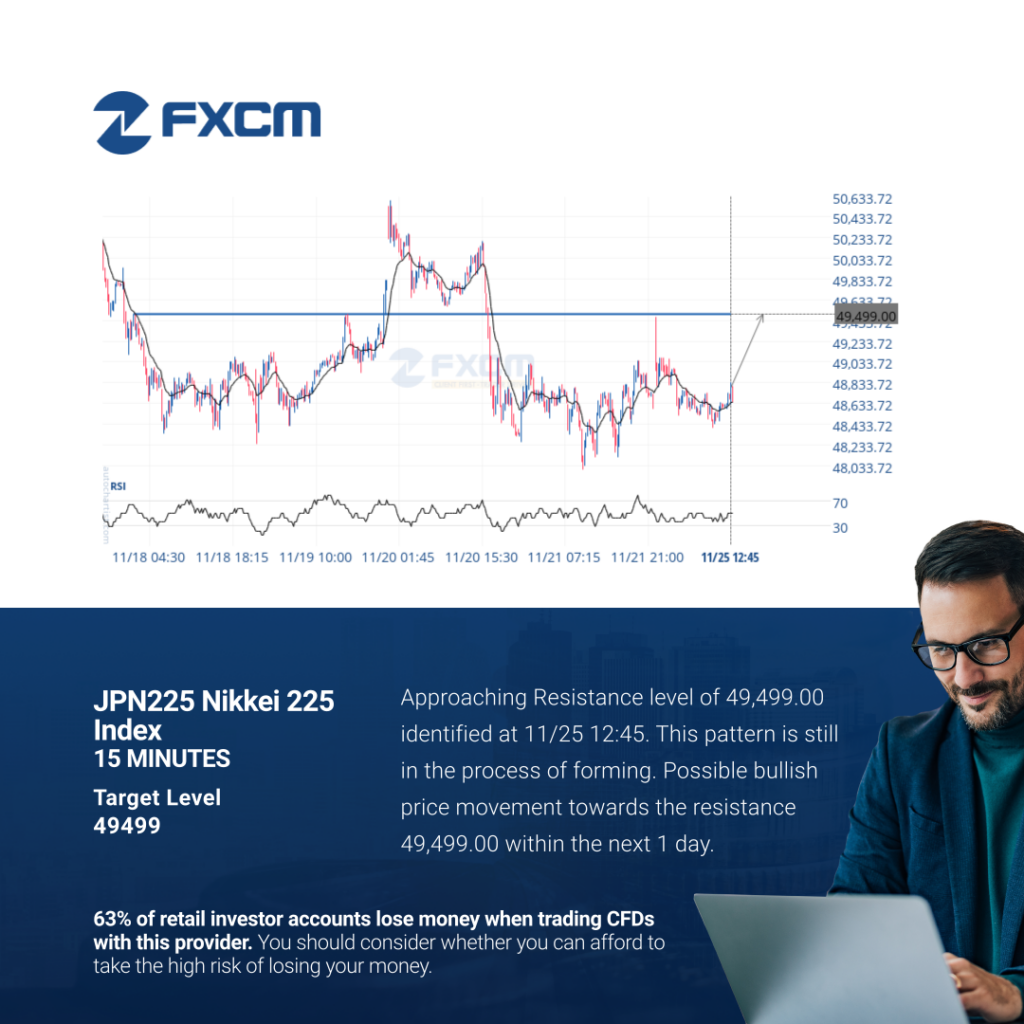 Approaching Resistance level of 49,499.00 identified at 11/25 12:45. This pattern is still in the process of forming. Possible bullish price movement towards the resistance 49,499.00 within the next 1 day. Past performance is not an indicator of future results. Losses can exceed deposits.
