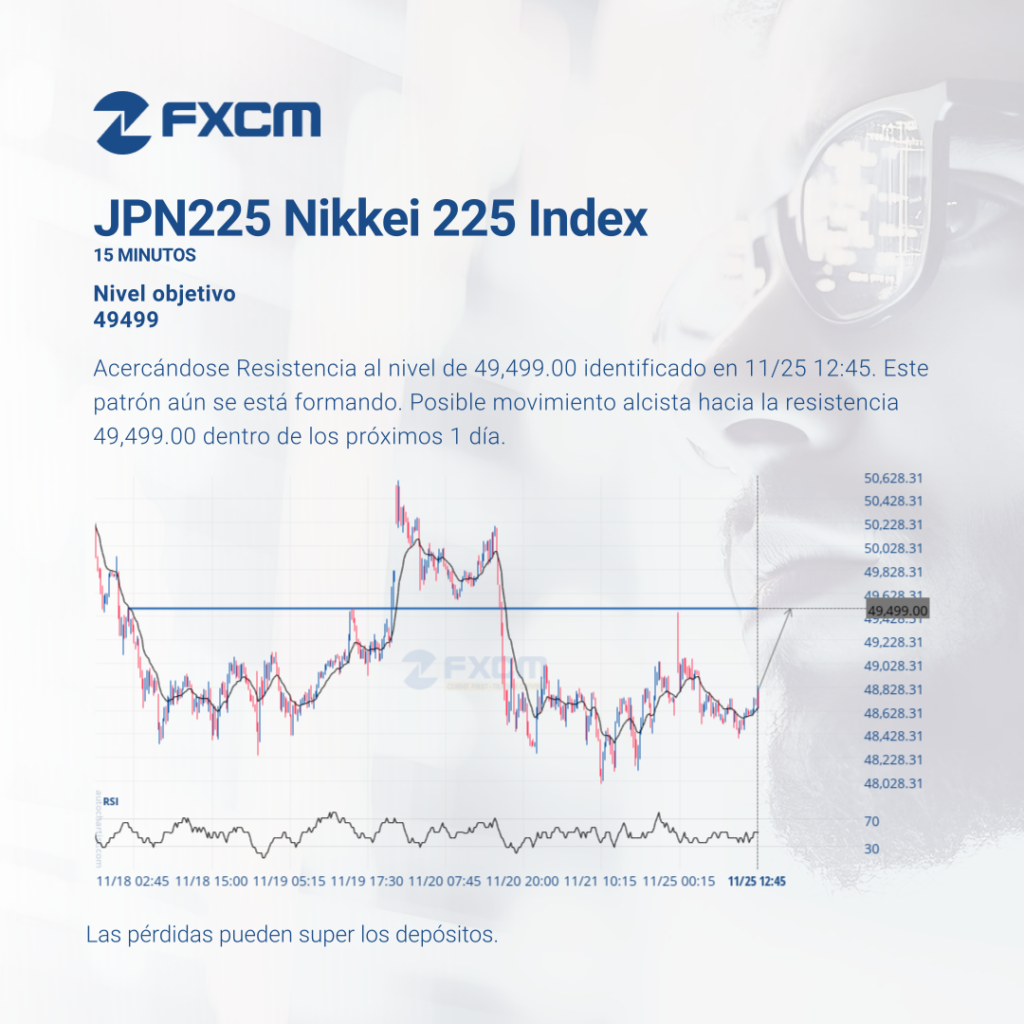 Acercándose Resistencia al nivel de 49,499.00 identificado en 11/25 12:45. Este patrón aún se está formando. Posible movimiento alcista hacia la resistencia 49,499.00 dentro de los próximos 1 día. El rendimiento pasado no es indicativo de resultados futuros. Las pérdidas pueden exceder los fondos depositados.