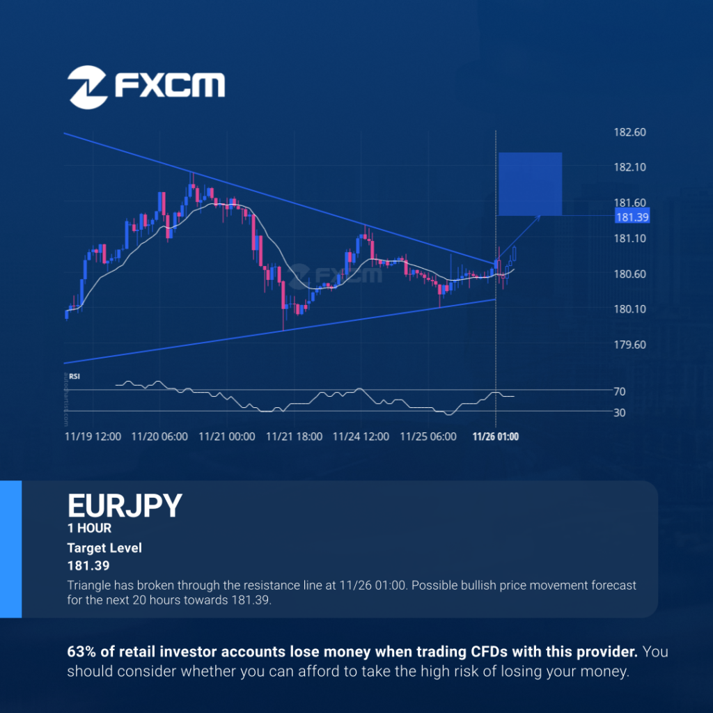 Triangle has broken through the resistance line at 11/26 01:00. Possible bullish price movement forecast for the next 20 hours towards 181.39. Past performance is not an indicator of future results. Losses can exceed deposits.