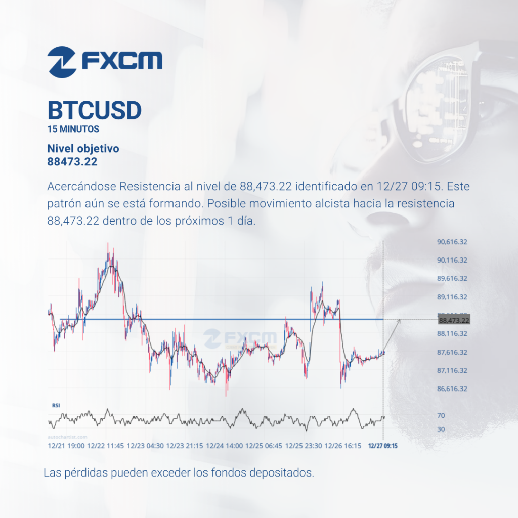 Acercándose Resistencia al nivel de 88,473.22 identificado en 12/27 09:15. Este patrón aún se está formando. Posible movimiento alcista hacia la resistencia 88,473.22 dentro de los próximos 1 día. Las pérdidas pueden exceder los depósitos.