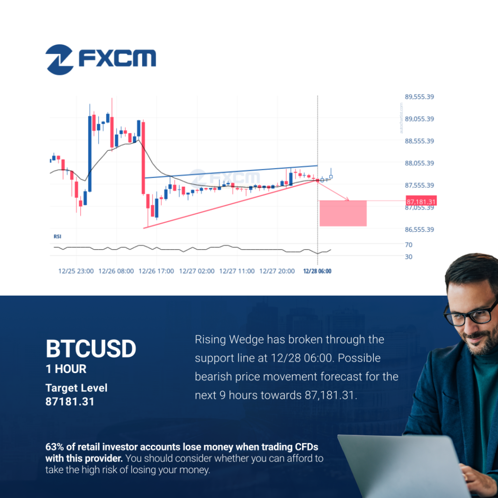 Rising Wedge has broken through the support line at 12/28 06:00. Possible bearish price movement forecast for the next 9 hours towards 87,181.31. Past performance is not an indicator of future results. Losses can exceed deposits.