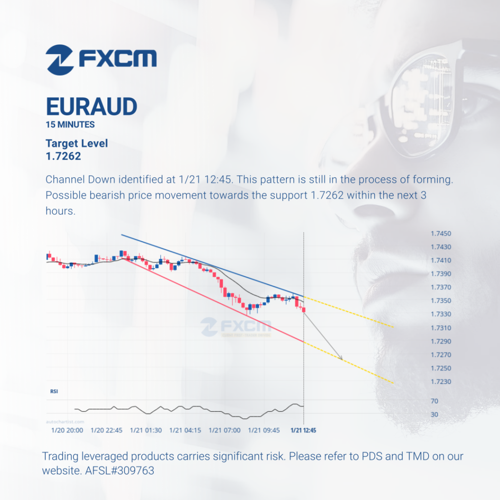 Channel Down identified at 1/21 12:45. This pattern is still in the process of forming. Possible bearish price movement towards the support 1.7262 within the next 3 hours. Past performance is not an indicator of future results. Trading leveraged products carries significant risk. Please refer to PDS and TMD on our website. AFSL#309763