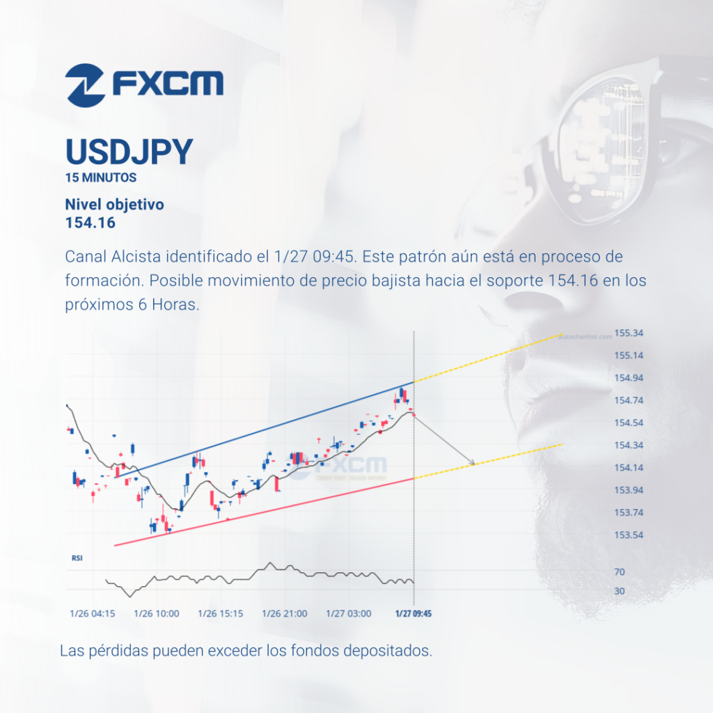 Canal Alcista identificado el 1/27 09:45. Este patrón aún está en proceso de formación. Posible movimiento de precio bajista hacia el soporte 154.16 en los próximos 6 Horas. Las pérdidas pueden exceder los depósitos.