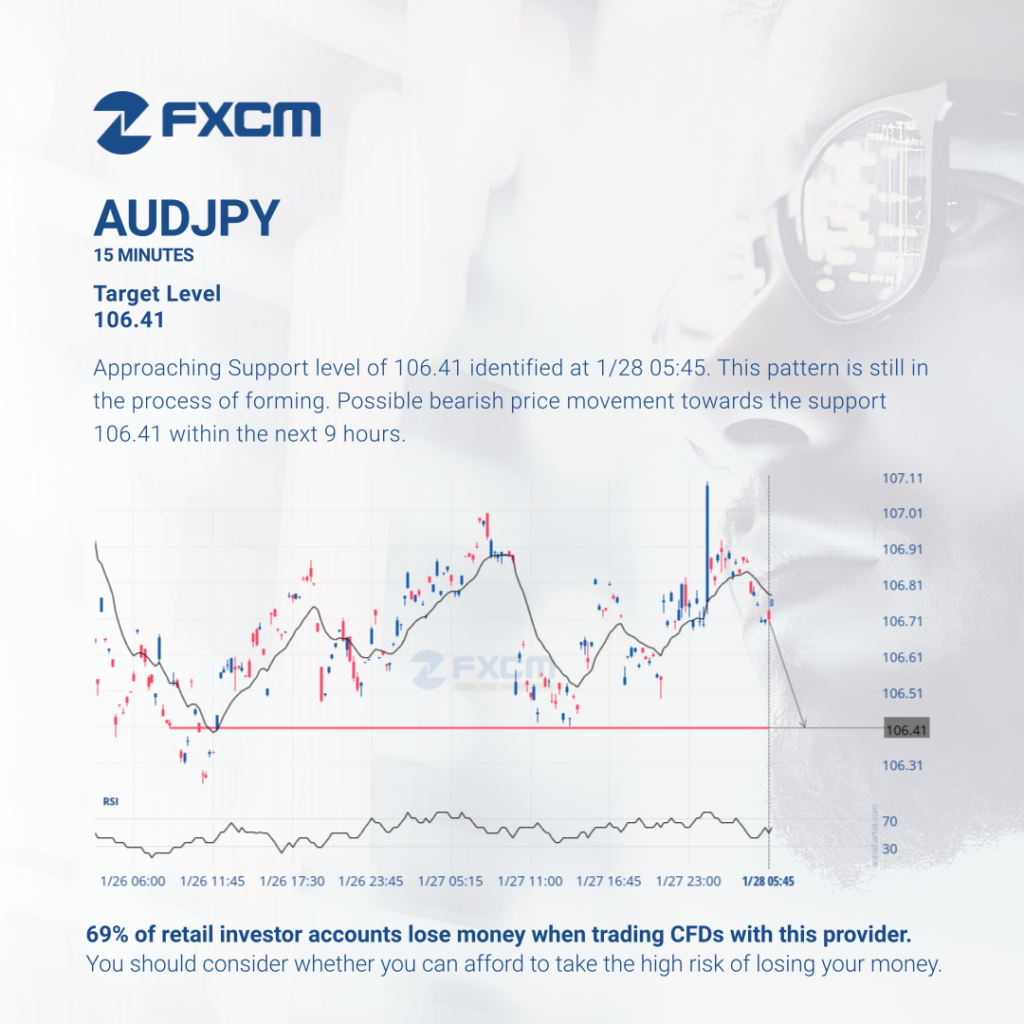 Approaching Support level of 106.41 identified at 1/28 05:45. This pattern is still in the process of forming. Possible bearish price movement towards the support 106.41 within the next 9 hours. Past performance is not an indicator of future results. Losses can exceed deposits.