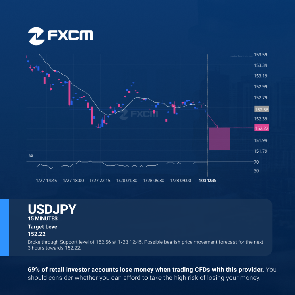 Broke through Support level of 152.56 at 1/28 12:45. Possible bearish price movement forecast for the next 3 hours towards 152.22. Past performance is not an indicator of future results. Losses can exceed deposits.