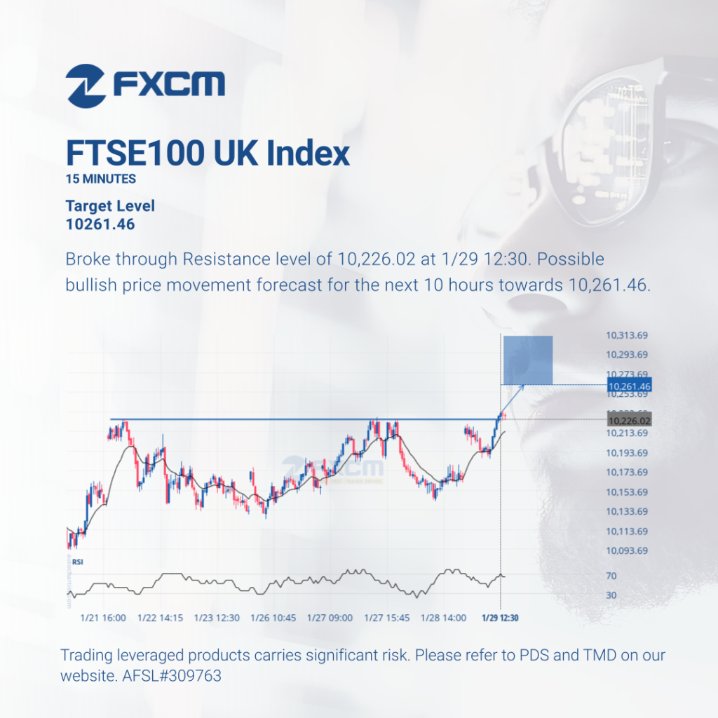 Broke through Resistance level of 10,226.02 at 1/29 12:30. Possible bullish price movement forecast for the next 10 hours towards 10,261.46. Past performance is not an indicator of future results. Trading leveraged products carries significant risk. Please refer to PDS and TMD on our website. AFSL#309763
