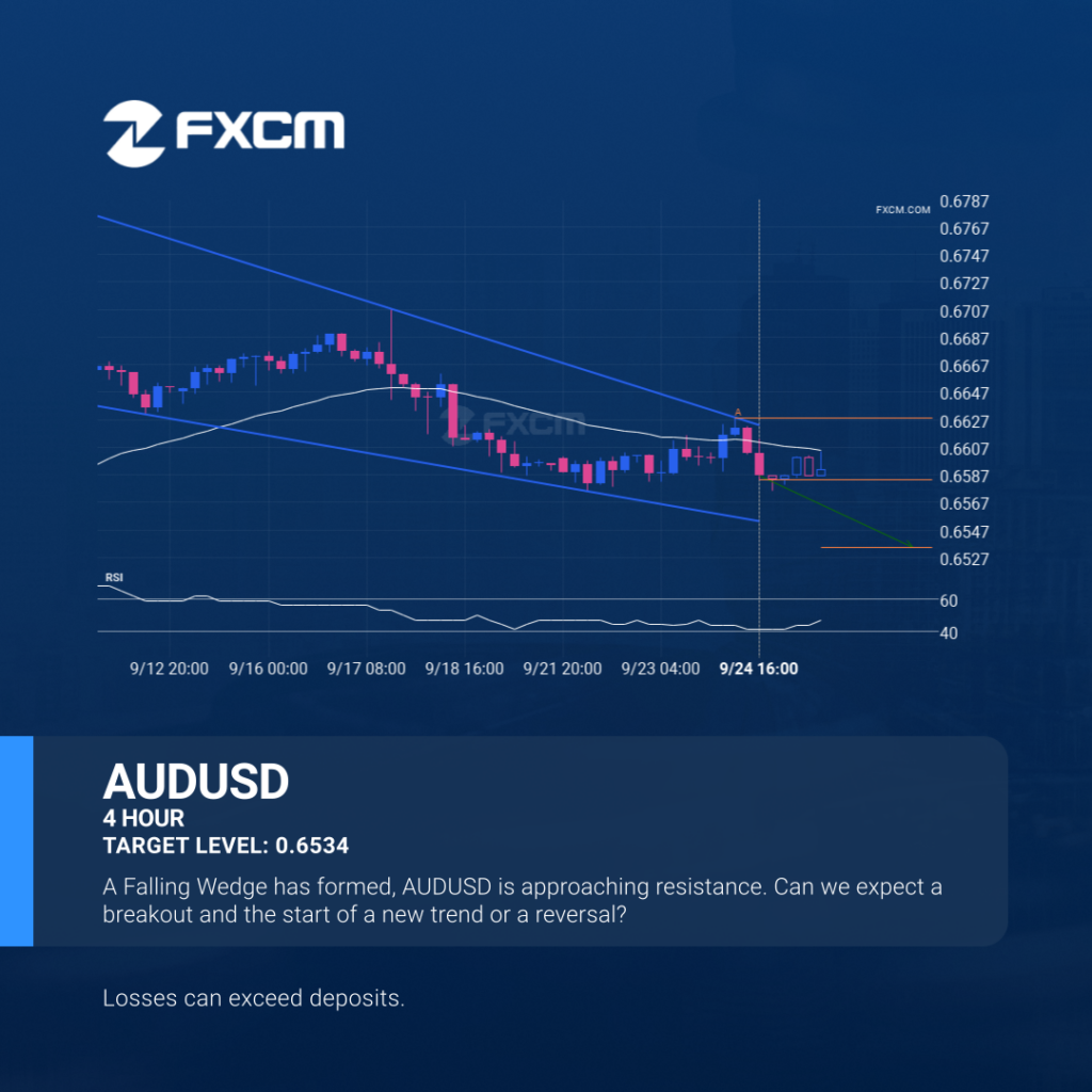 A Falling Wedge pattern was identified on AUDUSD at 0.658335, creating an expectation that it may move to the support line at 0.6534. It may break through that line and continue the bearish trend or it may reverse from that line. Past performance is not an indicator of future results. Losses can exceed deposits.