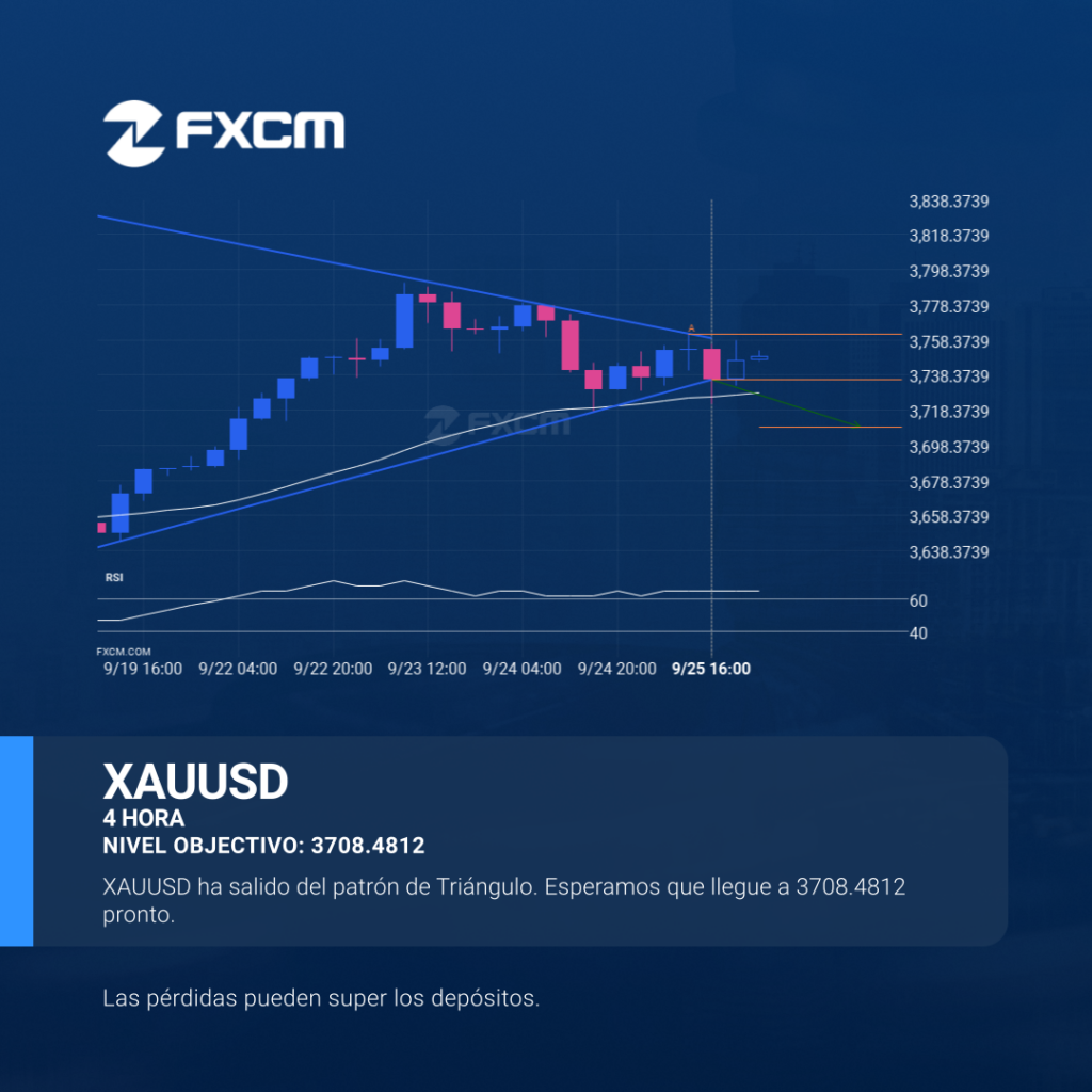 El XAUUSD ha atravesado una línea de soporte de un patrón de gráfico que corresponde a un Triángulo. Si esta irrupción se mantiene, podríamos ver el precio del XAUUSD probando el nivel de 3708.4812 dentro de las próximas 23 horas. Pero no se apresure si desea operar, porque ya ha probado esta línea en el […]