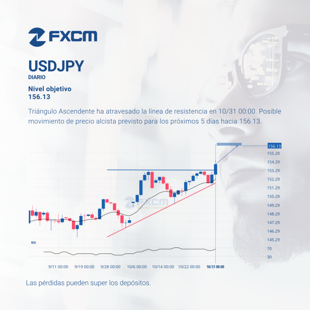 Triángulo Ascendente ha atravesado la línea de resistencia en 10/31 00:00. Posible movimiento de precio alcista previsto para los próximos 5 días hacia 156.13. El rendimiento pasado no es indicativo de resultados futuros. Las pérdidas pueden exceder los fondos depositados.