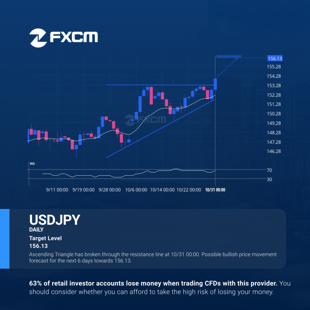 Ascending Triangle has broken through the resistance line at 10/31 00:00. Possible bullish price movement forecast for the next 6 days towards 156.13. Past performance is not an indicator of future results. Losses can exceed deposits.