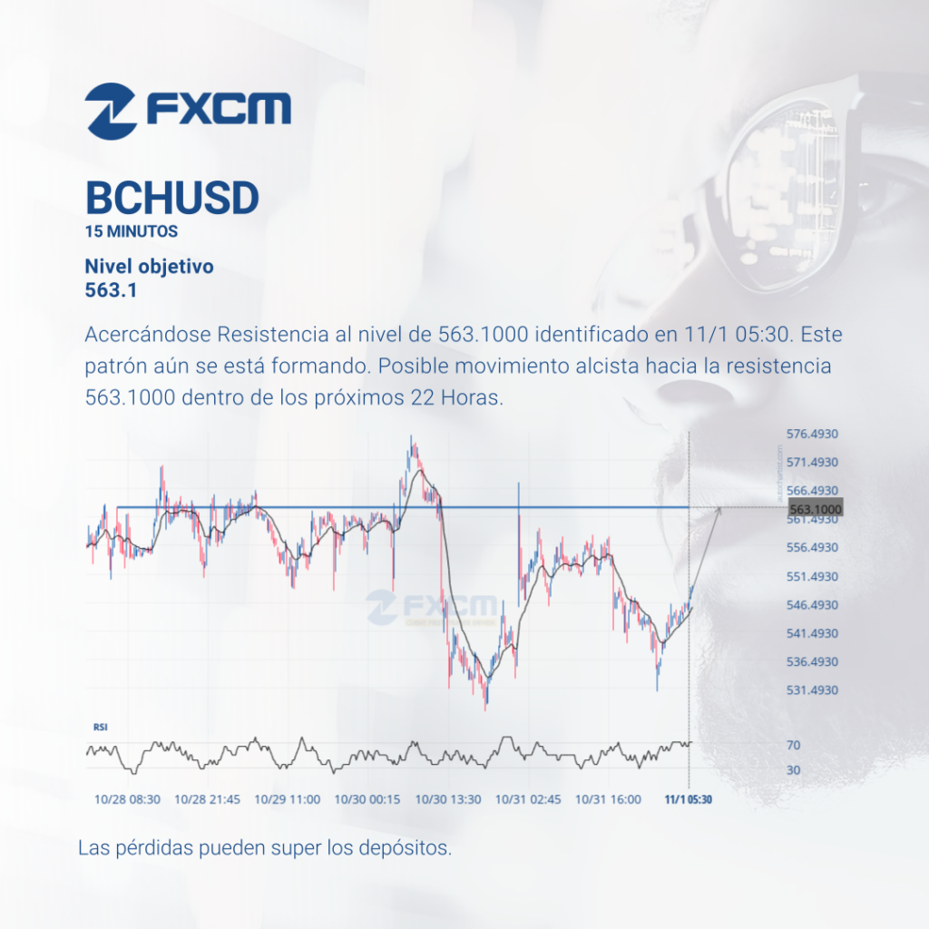 Acercándose Resistencia al nivel de 563.1000 identificado en 11/1 05:30. Este patrón aún se está formando. Posible movimiento alcista hacia la resistencia 563.1000 dentro de los próximos 22 Horas. El rendimiento pasado no es indicativo de resultados futuros. Las pérdidas pueden exceder los fondos depositados.