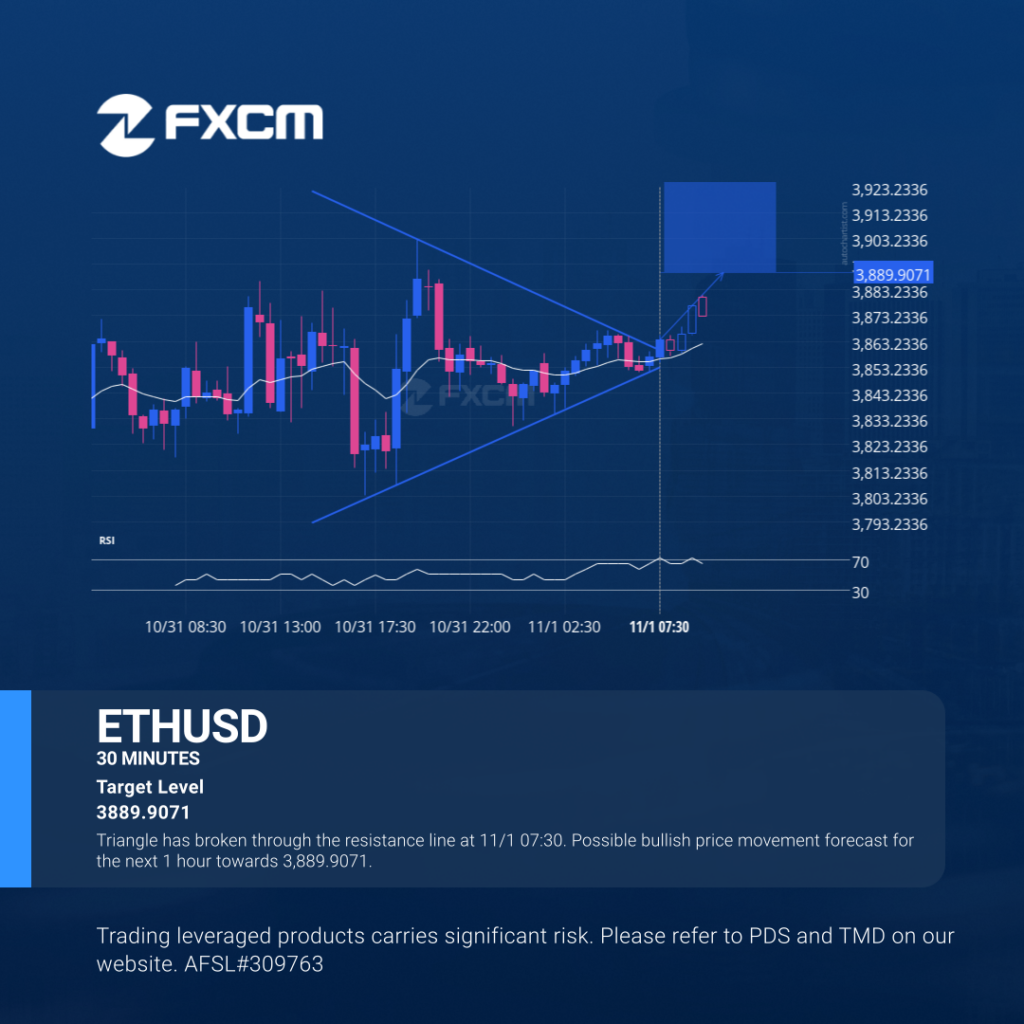 Triangle has broken through the resistance line at 11/1 07:30. Possible bullish price movement forecast for the next 1 hour towards 3,889.9071. Past performance is not an indicator of future results. Trading leveraged products carries significant risk. Please refer to PDS and TMD on our website. AFSL#309763