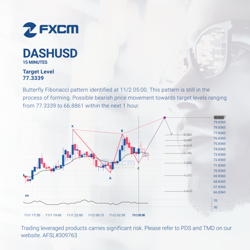 Butterfly Fibonacci pattern identified at 11/2 05:00. This pattern is still in the process of forming. Possible bearish price movement towards target levels ranging from 77.3339 to 66.8861 within the next 1 hour. Past performance is not an indicator of future results. Trading leveraged products carries significant risk. Please refer to PDS and TMD on […]