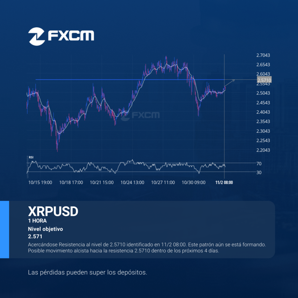 Acercándose Resistencia al nivel de 2.5710 identificado en 11/2 08:00. Este patrón aún se está formando. Posible movimiento alcista hacia la resistencia 2.5710 dentro de los próximos 4 días. El rendimiento pasado no es indicativo de resultados futuros. Las pérdidas pueden exceder los fondos depositados.