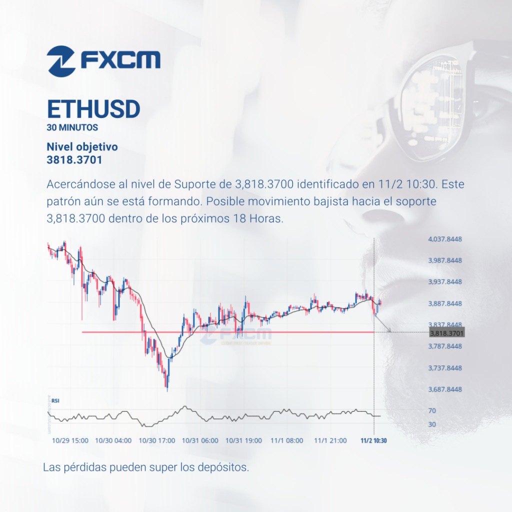 Acercándose al nivel de Suporte de 3,818.3700 identificado en 11/2 10:30. Este patrón aún se está formando. Posible movimiento bajista hacia el soporte 3,818.3700 dentro de los próximos 18 Horas. El rendimiento pasado no es indicativo de resultados futuros. Las pérdidas pueden exceder los fondos depositados.