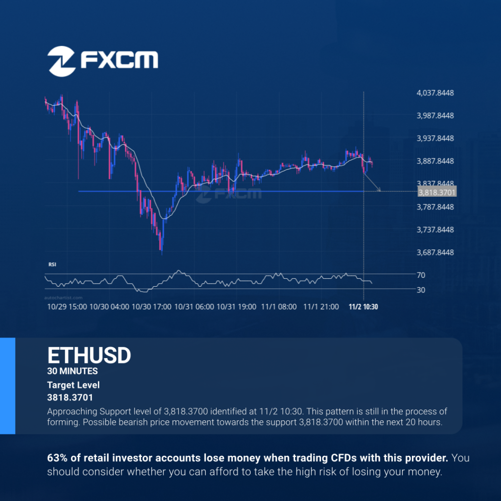 Approaching Support level of 3,818.3700 identified at 11/2 10:30. This pattern is still in the process of forming. Possible bearish price movement towards the support 3,818.3700 within the next 20 hours. Past performance is not an indicator of future results. Losses can exceed deposits.