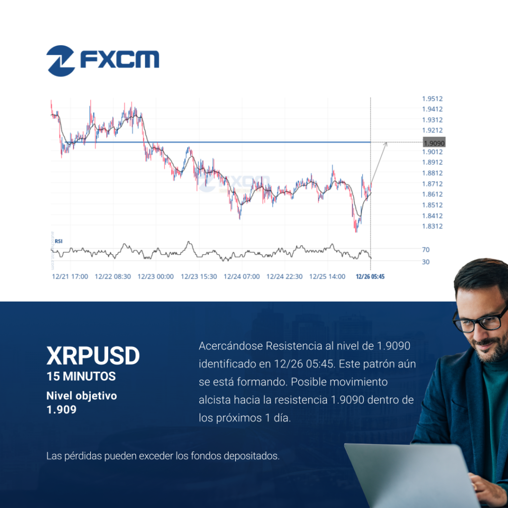 Acercándose Resistencia al nivel de 1.9090 identificado en 12/26 05:45. Este patrón aún se está formando. Posible movimiento alcista hacia la resistencia 1.9090 dentro de los próximos 1 día. Las pérdidas pueden exceder los depósitos.