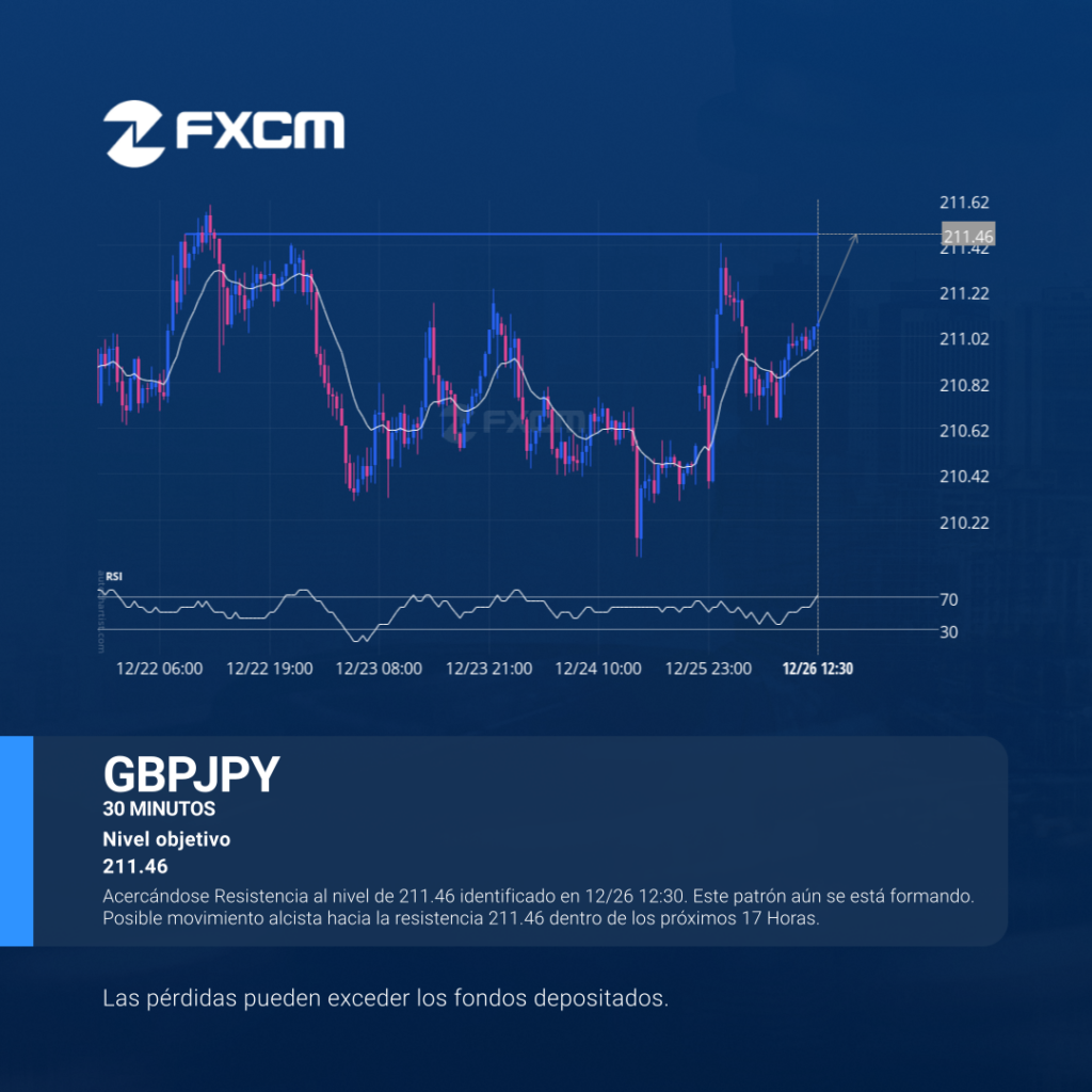 Approaching Resistance level of 211.46 identified at 12/26 12:30. This pattern is still in the process of forming. Possible bullish price movement towards the resistance 211.46 within the next 17 hours. Past performance is not an indicator of future results. Losses can exceed deposits.
