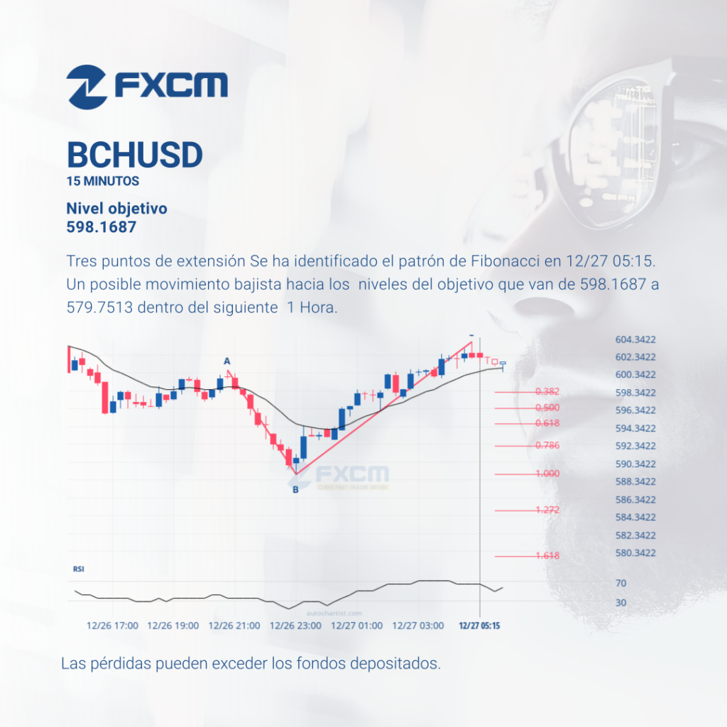 Tres puntos de extensión Se ha identificado el patrón de Fibonacci en 12/27 05:15. Un posible movimiento bajista hacia los niveles del objetivo que van de 598.1687 a 579.7513 dentro del siguiente 1 Hora. Las pérdidas pueden exceder los depósitos.