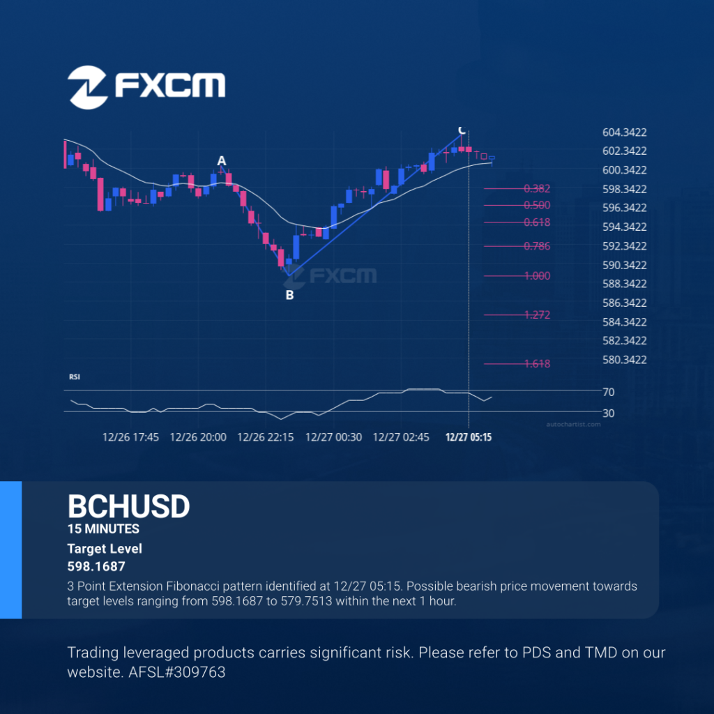 3 Point Extension Fibonacci pattern identified at 12/27 05:15. Possible bearish price movement towards target levels ranging from 598.1687 to 579.7513 within the next 1 hour. Past performance is not an indicator of future results. Trading leveraged products carries significant risk. Please refer to PDS and TMD on our website. AFSL#309763
