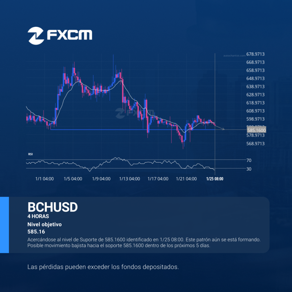 Acercándose al nivel de Suporte de 585.1600 identificado en 1/25 08:00. Este patrón aún se está formando. Posible movimiento bajista hacia el soporte 585.1600 dentro de los próximos 5 días. El rendimiento pasado no es indicativo de resultados futuros. Las pérdidas pueden exceder los depósitos.