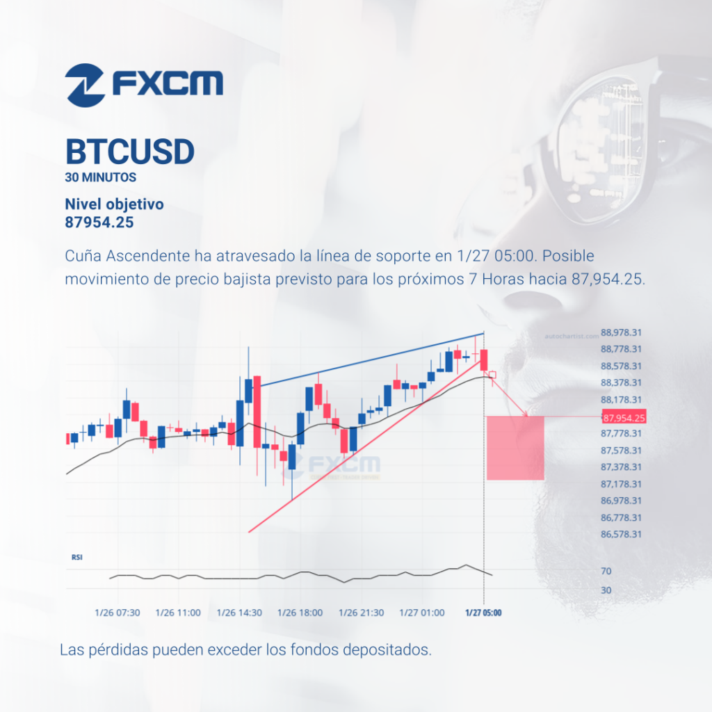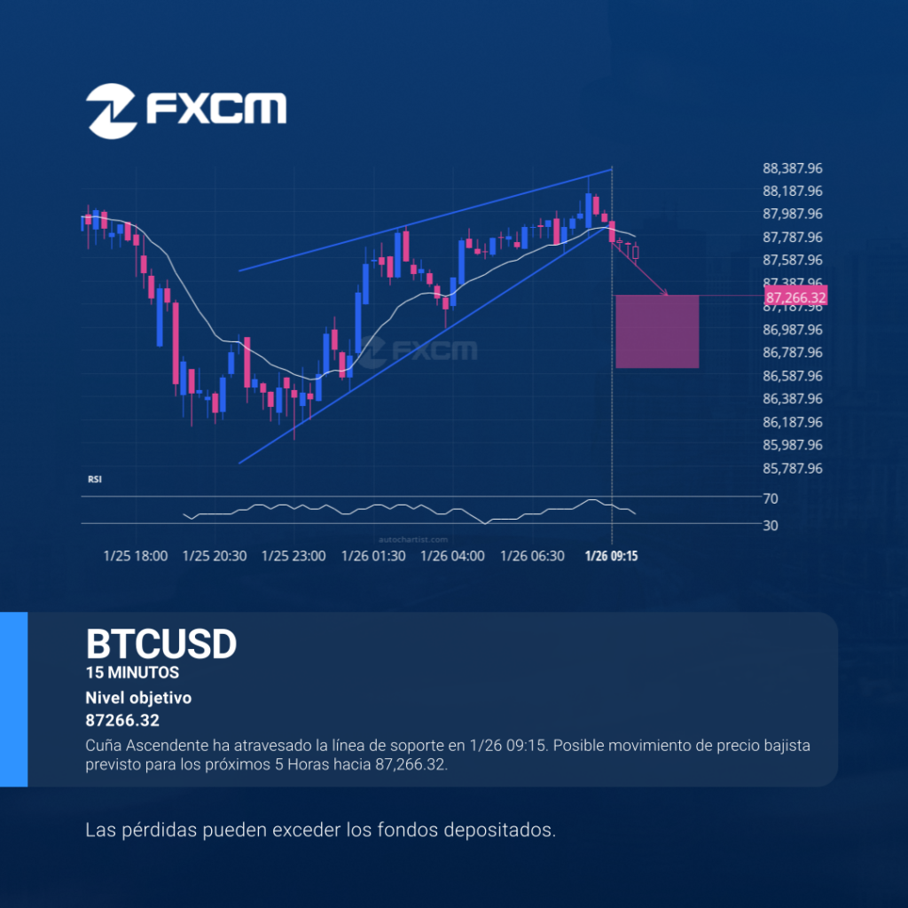 Cuña Ascendente ha atravesado la línea de soporte en 1/26 09:15. Posible movimiento de precio bajista previsto para los próximos 5 Horas hacia 87,266.32. El rendimiento pasado no es indicativo de resultados futuros. Las pérdidas pueden exceder los depósitos.