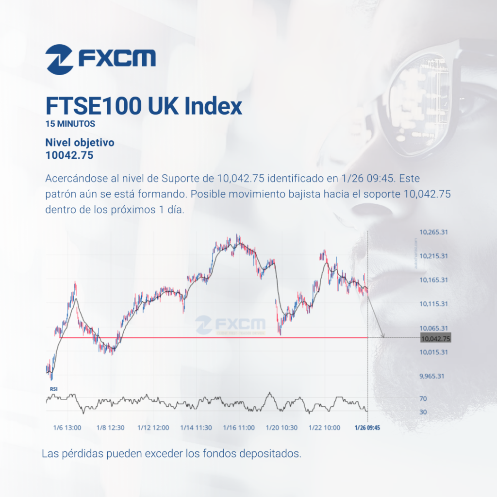 Acercándose al nivel de Suporte de 10,042.75 identificado en 1/26 09:45. Este patrón aún se está formando. Posible movimiento bajista hacia el soporte 10,042.75 dentro de los próximos 1 día. Las pérdidas pueden exceder los depósitos.