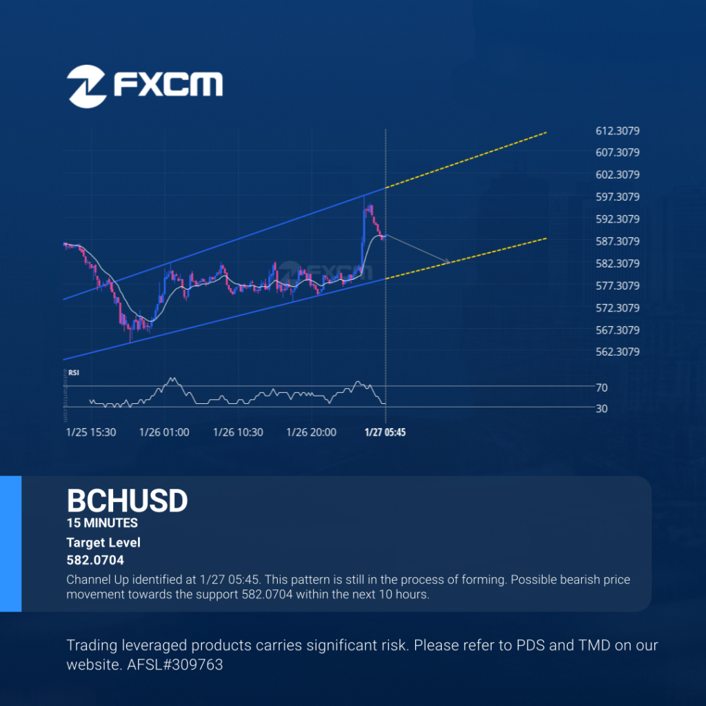 Channel Up identified at 1/27 05:45. This pattern is still in the process of forming. Possible bearish price movement towards the support 582.0704 within the next 10 hours. Past performance is not an indicator of future results. Trading leveraged products carries significant risk. Please refer to PDS and TMD on our website. AFSL#309763