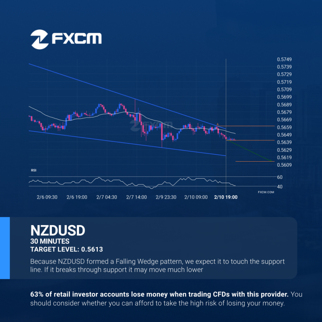 NZDUSD is approaching the support line of a Falling Wedge. It has touched this line numerous times in the last 6 days. If it tests this line again, it should do so in the next 16 hours. Past performance is not an indicator of future results. 64% of retail investor accounts lose money when trading […]